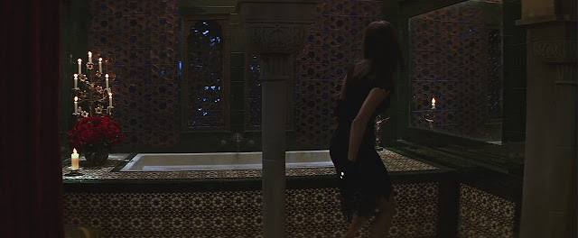 One enchanted evening in Seville our couple meets in a sweeping villa. Everyone is distracted by the dance performance which sets the tone of vigor and grace that shapes even the film's biggest action sequences. The villa has the sort of traditional Moorish architecture you would expect to find in Spain: arched doorways, mosaic tiles, intricate lattice patterns, as well as traditional accessories such as brass lanterns, antique wooden furniture, and baroque candlesticks: